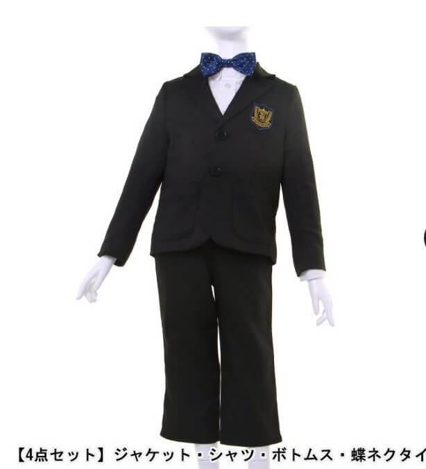 出典:fo-online.jpこちらはうれしい4点セットのフォーマルスーツです。ジャケット、パンツにワイシャツ、蝶ネクタイが付いています。買ったその日からすぐにおでかけできますよ!
