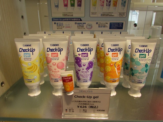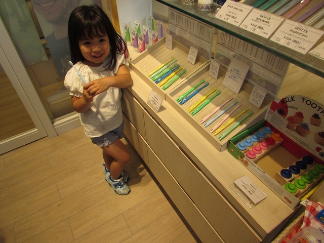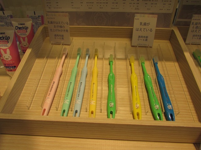 オーラリシスでは、大人用の歯ブラシは自由に手に取ってレジまで持っていけるようになっているのですが、子ども用だけは、見本のものしか並べられていません。