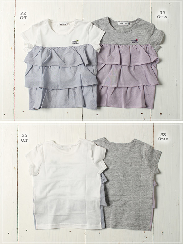 出典:www.bebe-shop.jpベビー・キッズアパレルブランドBeBeの姉妹ブランドから販売されているフリル付きTシャツです。カラーはオフホワイトとグレーの2色展開で、フリル部分はストライプ柄になっています。