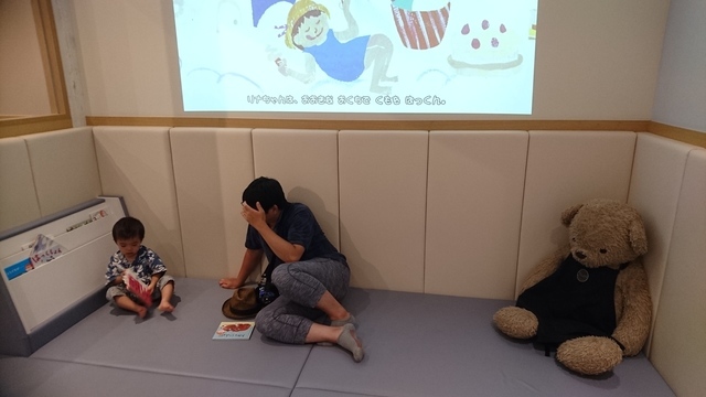 我が家のわんぱくな2歳児も窮屈なベビーカーから解放されて、こちらの空間で少し歩いたりゴロゴロしたあと、座って絵本を見ていました。落ち着いた空間なので、子どももまったりと過ごしてくれるようです!