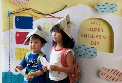 お洒落な英字新聞で兜を折った後は、子どもの日にちなんだグラフィックポスターの前で記念撮影!