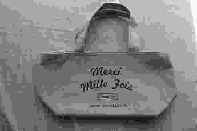横長トートタイプのグレーは、小ぶりでサブバッグとして使いやすそうです。プリント文字は、筆記体で「Merci Mille Fois」と書かれています。