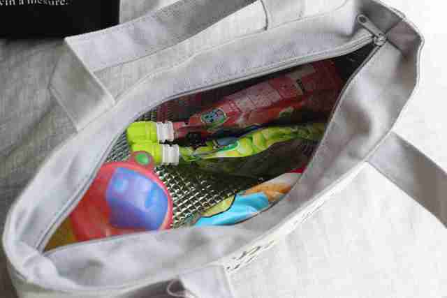 こちらも内側は全面アルミ素材の保冷バッグになっています。横長タイプと同じで開口部はファスナーです。やんちゃな子どもを追いかけても中身が飛び出ません!