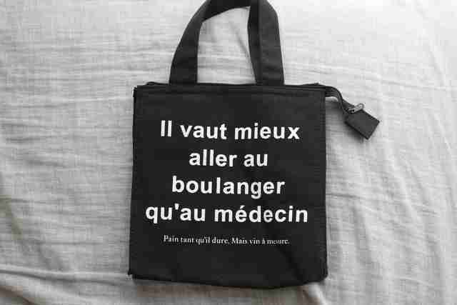 こちらは正方形タイプです。サイズは22センチ×22センチで、プリント文字は「ll vaut mieux aller au boulanger qu’au medecin」と白で書かれています。