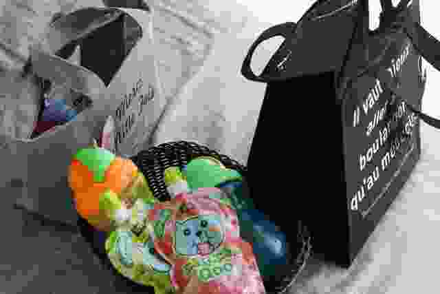 カラバリはホワイト、グレー、ブラック、ピンクの色があり、全て300円。横長トートタイプと正方形タイプで印象が違い、入る量も違うので、色違いやタイプ違いを複数買いして使い分けるのもいいですね。