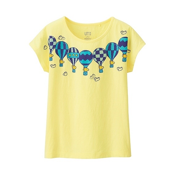 出典:www.uniqlo.com根強い人気を誇るスヌーピーシリーズ。そのなかからスヌーピーの相棒ウッドストックが気球に乗っているかわいいプリントです。クリームイエローの色味も女の子のかわいさを引き立ててくれますね!