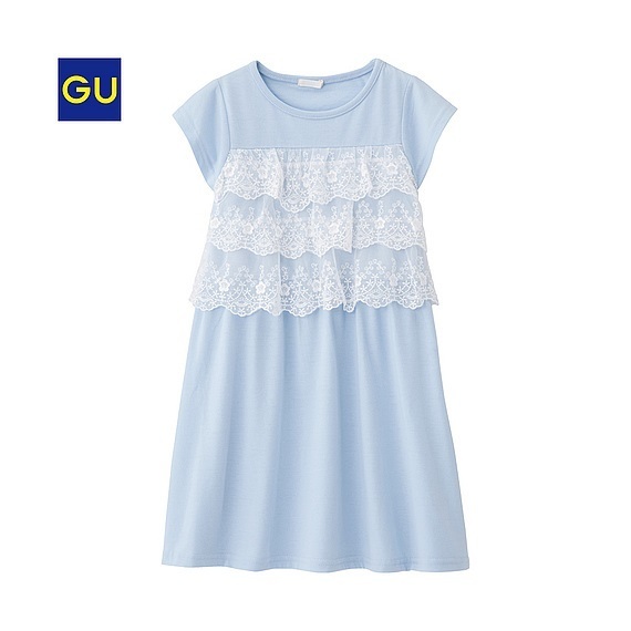 GIRLSレースティアードワンピース990円を合わせて、淡いパステルブルーで統一してみましょう!女の子っぽいレース使用のワンピースです。