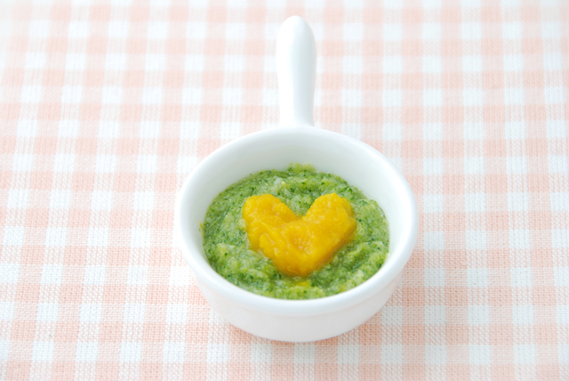 ブロッコリーのペーストは鮮やかな緑色が見た目にも華やかなので、真っ白なお粥の上にプラスすると、その鮮やかなコントラストが食欲をそそりますよ。オレンジ色のにんじんのペーストと並べるのもおすすめです。
