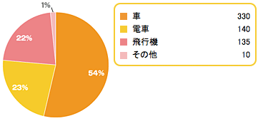 出典:www.combibaby.com移動手段で一番多かったのは、車でした。半分以上の方が車を利用されています。他の交通手段に比べると、歩く距離が少なくて済み、荷物を持ち歩く場面も少なくなるので、体への負担が少なくすみますね。 次に、電車(23%)、飛行機(22%)と続きました。