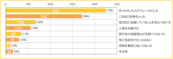 そして三番目には「宿泊先に妊娠を伝えておいた」(22%)でした。事前に連絡することで、到着後様々なお願いもしやすくなりそうですね。宿泊先の従業員さんも、心の準備&受け入れ態勢をしておいてくれるかもしれません。
