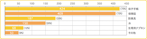 次に「防寒具」(33%)。「妊婦さんは体を冷やさないように」、とはよく言われること。冬場はもちろん、夏場のエアコン対策にも必要かもしれません。そして、「水」(26%)、「生理用ナプキン」(12%)と続きました。
