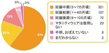 続いて「妊娠初期」20%、「妊娠後期」13%でした。妊娠初期は特に締め付け感が気になってマタニティウェアを使い始めるようです。