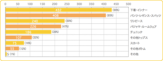そして、お腹部分が伸び、冷え防止にもなるパンツ・レギンス・スパッツは、妊婦さんにはとても便利。シーンに合わせトップスを変えれば、おしゃれも楽しめるとあって人気のようです。その他では、お腹をカバーできる「ワンピース」「チュニック」が上位にきています。