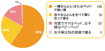 「一緒のふとん」で寝ている方(59%)、「別々のふとんを並べて隣り合って寝ている」(24%)、合わせて83%の方が、隣で寄り添って寝ているということです。