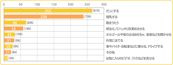 多かったのは「だっこする」(81%)および「授乳をする」(73%)の2つでした。やはり不安で泣いている子を安心させてあげる意味で、一番の方法なのかもしれませんね。