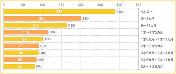 そして、「1才~1才5カ月」(13%)、「1才6カ月~1才11カ月」(11%)と1才児が続き、2才前半・後半、3才前半・後半は約10%ずついらっしゃいました。