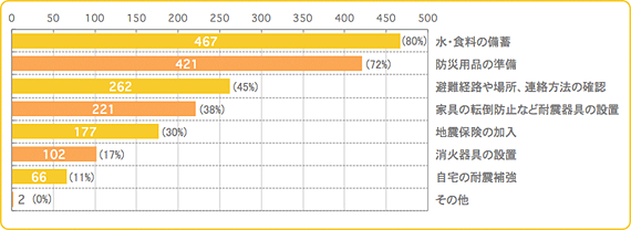 過半数を超えて多かったのは、「水・食料の備蓄」(80%)と「防災用品の準備」(72%)でした。震災後に食料や防災用品を求める人が多く、品物が足りない期間がありました。