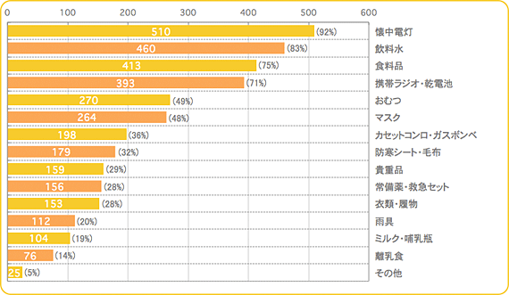 過半数の方が準備しているのが、「懐中電灯」(92%)、「飲料水」(83%)、「食料品」(75%)、「携帯ラジオ・乾電池」(71%)でした。