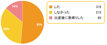 出典:www.combibaby.com里帰り出産をした、またはする予定の方が全体の51%という結果になりました。出産後に里帰りという方も合わせると全体の65%の方が産後は実家のお世話になるということで、産後のサポートは実家に頼る方が多数派であることもわかります。