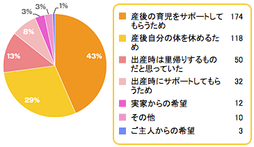 出典:www.combibaby.com里帰りをした理由をお伺いしました。 一番多かったのは「産後の育児をサポートしてもらうため」(43%)、次に「産後自分の体を休めるため」(29%)と続きました。