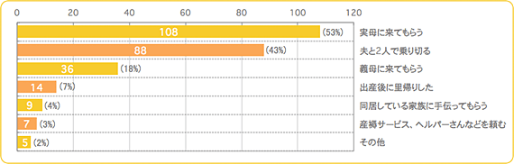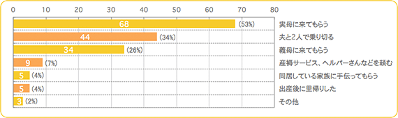 出典:www.combibaby.com里帰り出産をしなかった方に、どのように乗り切ったかをお伺いしました。 産褥サービス、ヘルパーさんなど他人の手を借りることは少なく、やはり家族の協力が高い割合となっています。