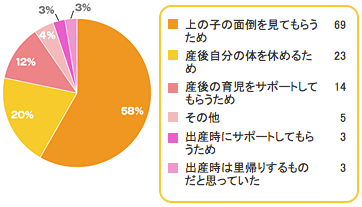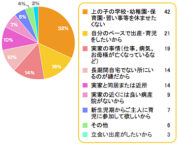 出典:www.combibaby.com「上の子の面倒を見てもらうため」が6割近くと、1番大きな理由となりました。 入院中の子どもの面倒を誰かに見てもらわなければならないこと、出産後まだ体力が回復しない中で、新生児のお世話をしながら上の子の世話まではなかなか手が回らないというのが第2子出産時には大きな課題となってきます。