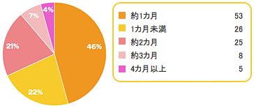 出典:www.combibaby.com第2子出産時の里帰り期間をお伺いしました。 滞在期間は第1子の時と比べて、全体的に短くなり、「1ヶ月」(46%)、「1ヶ月未満」(22%)の方が過半数を占めています。