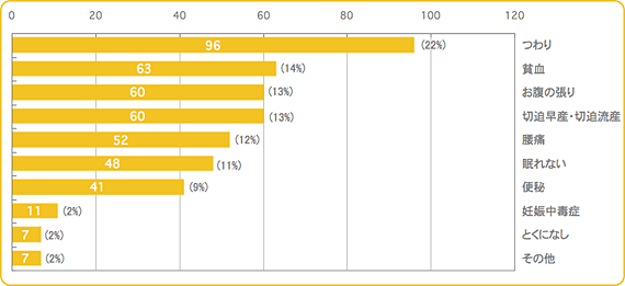 そして、貧血、おなかの張り、切迫早産・切迫流産は、それぞれ4割の方が経験されています。胎児が二人いる分、その重量的にも栄養的にも、ママの体にも影響が大きいのかもしれません。