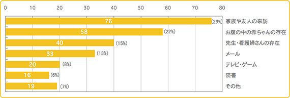 管理入院された83名のうち76名、90%の方が、「家族や友人の来訪」を挙げてくださいました。パパ・上のお子さま・ご両親などの顔を見ると、不安も吹き飛んだことと思います。
