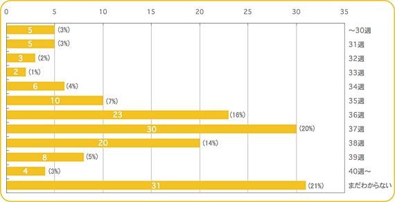 「まだわからない」方を除くと、7割の方が36週以降に出産されました。中でも多かったのが、37週。3割の方が37週に出産されました。