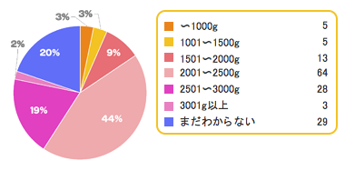 出典:www.combibaby.com「まだわからない」という方を除くと、54%と最も多かったのは、2000g前半の赤ちゃん。2000g未満の赤ちゃんは、19%でした。二人同時におなかで育つので、平均より小さめで産まれることが多いようです。