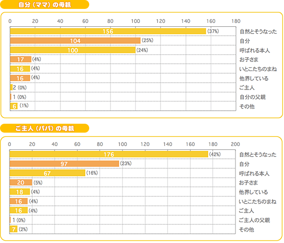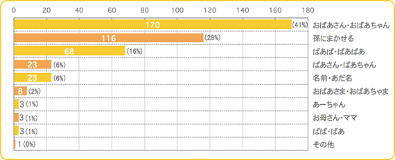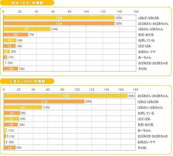 1人目が生まれたとき、母と義母が相談して自分たちの呼び方を決めました。義母が「おばあちゃん」を希望したので、母はいろいろ考えた末に「お○○(母の名前の一部)さん」「○○(父の名前の一部)ちゃん」という呼び方に落ち着きました。