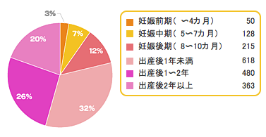 全体の22%が妊婦さん(妊娠前期の方が3%、妊娠中期の方が7%、妊娠後期の方が12%)。そして、出産後の方が78%でした(出産後1年未満の方が32%、出産後1〜2年の方が26%、出産後2年以上の方が20%)。