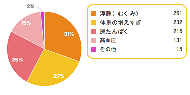一番多かったのは「浮腫(むくみ)」で、31%。ふくらはぎなどを指で押して、へこんだままの状態です。次に「体重の増えすぎ」で27%。妊婦健診で最も気になる項目かもしれません。