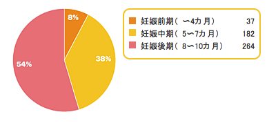 妊娠後期が一番多く、54%でした。一番体重の増えやすい時期ですね。そして妊娠前期という方が8%、妊娠中期という方が38%でした。