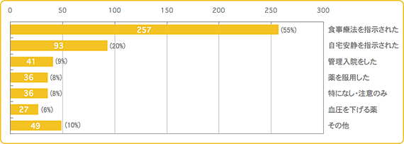 3番目に多かったのが「管理入院」(9%)。自宅安静が難しい重度の場合に、指示されるようです。そして「薬を服用した」(8%)、特になし8(%)、血圧を下げる薬(6%)と続きました。