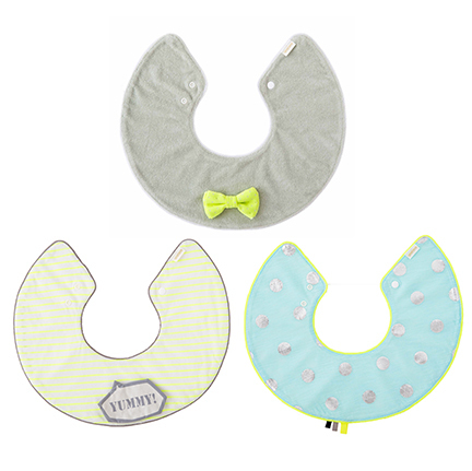 このスタイはスナップボタンでポンチョのように首を囲むデザインなので、よく動く赤ちゃんでも汚れが洋服につきにくいと評判です。また、取り外しができる蝶ネクタイや、「YUMMY!」と書かれた吹き出しなどデザイン性が高いのでおめかししたい時にもピッタリです。