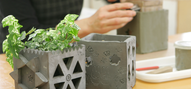 淡路島の地場産業である瓦をつくる粘土を使った陶芸体験です。こちらでは、あらかじめ筒型に加工した角柱の粘土を用意しており、それに型抜きやスタンプで模様をつけたり、絵を描いたりして、鉢カバーや鉛筆立て、ランプシェードのようなものを作っていただいています。