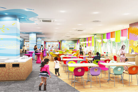 出典:www.uminomori.jpお食事がとれる場所は3か所あります。まず1か所目は1階のフードコート。子どもが好きそうなカラフルで明るい雰囲気の店内です。