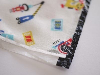 ※表から見たときに、ビニールが1cm程出ていてOK!ズレずに縫えるように、ビニールは一回り大きめにとります。