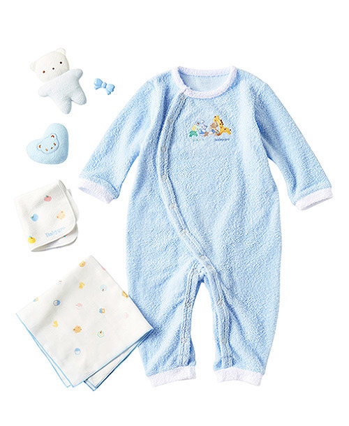 出典:www.ec.familiar.co.jpカバーオール、ガーゼハンカチ、ミニハンカチ、クマのマスコット、クマハート(マスコット)のセットです。