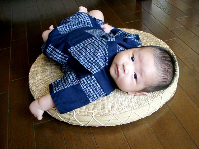 綿100%のデコボコとした素材は肌に密着せず、通気性があるので汗をたくさんかく赤ちゃんでもサラリと着こなせます。夏祭りや花火の時に活躍する甚平ですが、涼しく着られる素材なので夏の外遊びやお風呂上りにも使えます。