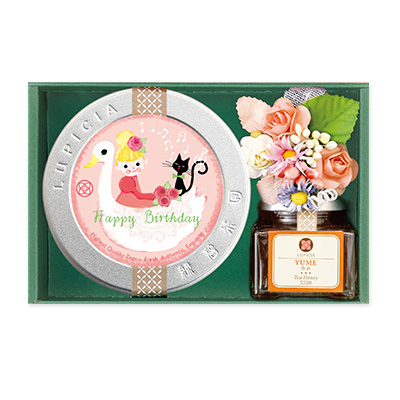 出典:www.lupicia.comお茶の専門店「ルピシア」では、1缶から名入れのできる商品があります。こちらはスワンのイラストがとってもかわいい紅茶とティーハニー(紅茶に入れるハチミツ)のセットです。小さなブーケもかわいいですね。
