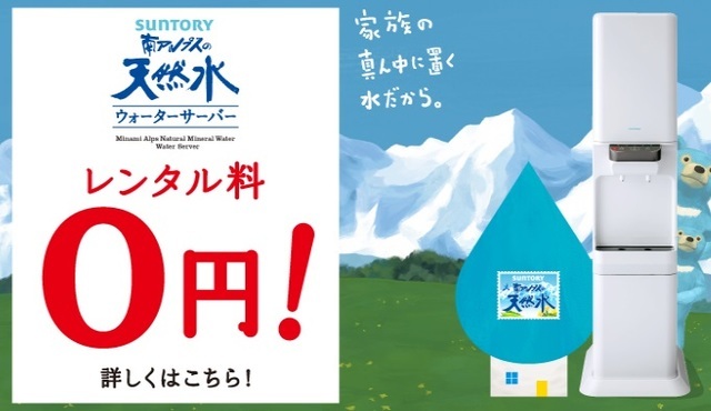 出典:www.suntoryws.comサントリーのウォーターサーバーは、ダンボールに入った7.8リットル入りの天然水ボトル、税込1,350円を3、6、9箱単位で注文します。サーバーレンタル料・初期費用・配送料・メンテナンス料は無料です。また、他社サーバーを使用している人の乗り換えキャンペーンも実施しています。