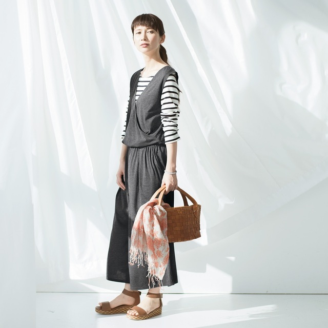 出典:www.felissimo.co.jp人気通販フェリシモからは、マタニティ用ではないものの、とても使えそうなオールインワンをご紹介。こちらは、前後を変えることによって、カシュクールタイプと丸首タイプの2WAYで着られます。