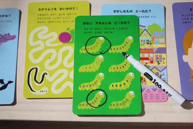100のあそびには、様々なジャンルのゲームがあります。マジックで絵を描く「おえかき系」のカード、同じものを探す「なかま探しゲーム」、そして「クイズゲーム」、「迷路」など。