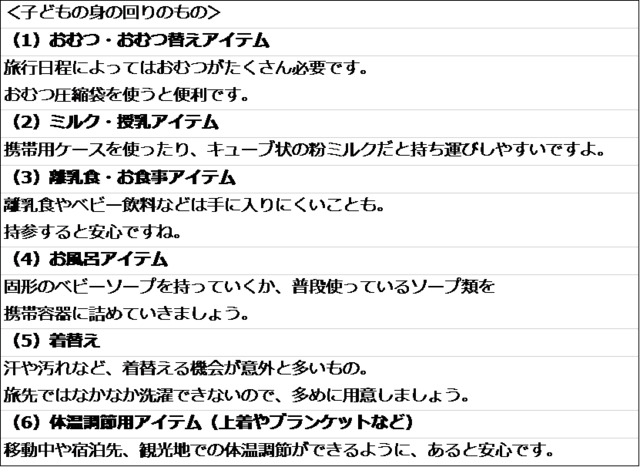 子どもとの旅行で特に大切なのは、お世話グッズの準備です。旅先では、欲しい!と思った時にすぐに手に入らないものもあるので、事前準備をしっかりしておくと安心ですね。