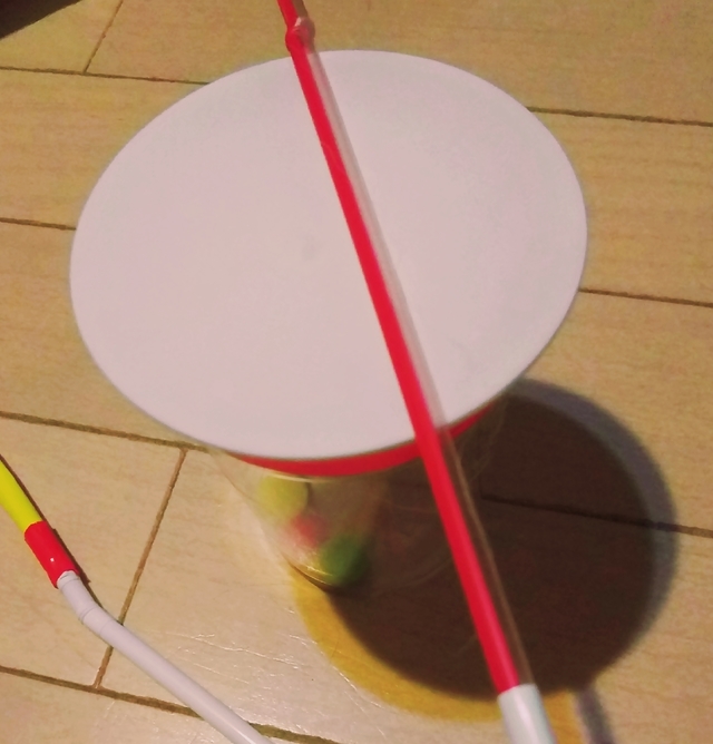 今回は手芸用ポンポンを中に入れましたが、他に鈴やお米などを容器に入れたたいこを作ると、違う音を楽しむことができるのでおすすめです。