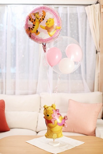 シンプルな丸いバルーンの中にピンクや白といった優しい色合いのバルーンが入っているバルーンと、プーさんとティガーが描かれたバルーンのセットで、あまり大きくないので場所を取らないのもいいですね。