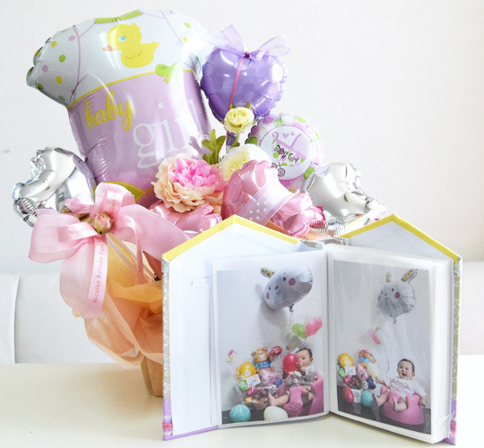 とてもかわいく実用的、またバルーンで華やかな雰囲気を添える事ができますよ。中身のおむつも少し大きめのサイズをチョイスしておけば出産後しばらく飾っておくこともできます。